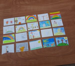Neulich brauchte Frau Voß unbedingt unsere Hilfe. Sie wollte an taubstumme Kinder, die Christen sind und verfolgt werden, Ermutigungskarten schreiben. Auf einmal dachte sie: „Warum soll ich das alleine machen? Ich habe doch 21 tolle Schreiber!“, und somit haben wir eine Ermutigungsaktion gestartet. Jeder hat eine Karte mit einem leuchtenden hoffnungsmachenden Bild und einem mutmachenden Bibelvers gestaltet. Frau Voß hat die Karten dann zu einer Freundin gebracht, die bei Open Doors arbeitet. Von dort sind sie zu den Kindern in Zentralasien geschickt worden. Wo das ist, darfst du selber mal rausfinden. Bei uns hat ein Junge das nachgeschaut, weil es ihn interessierte. So lernen wir uns in der Welt auszukennen.